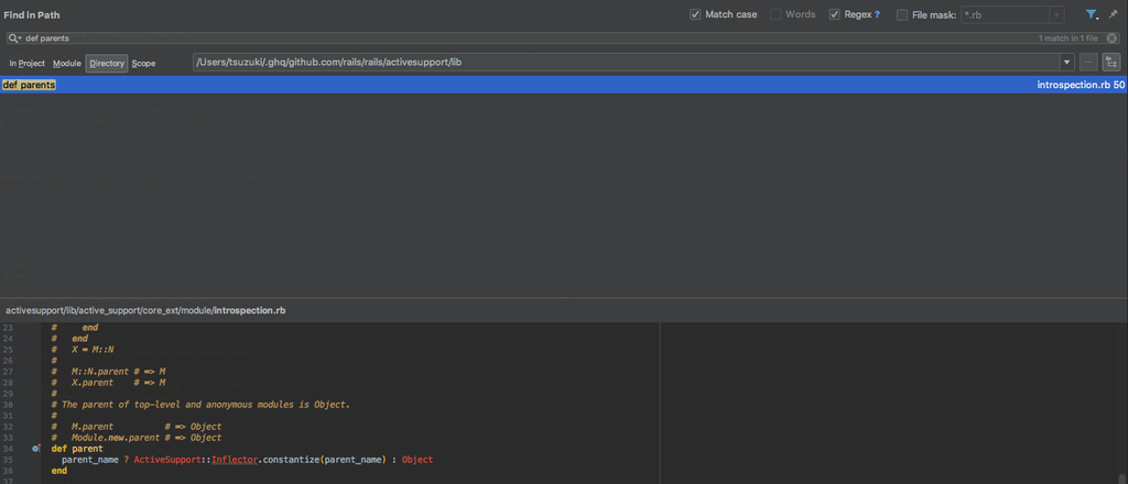 1. railsプロジェクトのactivesupportにある機能ですので、activesupportディレクトリのlib配下で def parents を探してみます